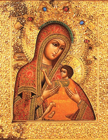 De icoon "O Algeprezen Moeder" ontleent zijn titel aan het dertiende Kontakion van de Akathist aan de Allerheiligste Theotokos: "O Algeprezen Moeder die het Woord droeg, heiligste van alle heiligen...".