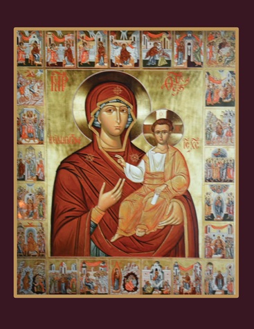 De Akathistos is een lange reeks lofzangen op de Moeder Gods, die in de jaren 500 in Constantinopel ontstond. In 1276 woonde er vlakbij het Bulgaarse klooster van Zografou een kluizenaar die zijn dagen doorbracht met het herhalen van de Akathistos voor een icoon van de Maagd met kind. Op een dag beantwoordde ze zijn groet: "Wees niet bang, maar ga snel de abt en de monniken vertellen dat de vijand nabij is. De lafhartigen moeten vluchten, maar zij die een martelaarskroon wensen, moeten blijven." Bij aankomst vond hij de icoon bij de poort. Hij bracht de waarschuwing van de Maagd over aan de abt. Al snel arriveerden de Catalaanse kruisvaarders. Kruisvaarders staken de toren in brand, waardoor de 26 mensen die zich erin bevonden op 10 oktober (23 oktober volgens de moderne kalender) tot orthodoxe martelaren werden gemaakt. Alleen het icoon overleefde, ongeschonden in de as.