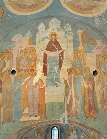 Een verschijning werd waargenomen door Sint Andreas de Fooi (gestorven in 936), zijn leerling Epiphanius en andere mensen die in de kerk baden tijdens een nachtelijke wake. Ze zagen de Maagd de kerk binnengaan, knielen in een betraand gebed en vervolgens opstijgen, haar sluier boven de gemeente houdend, en beschouwden dit als een teken van haar zorg voor hen.