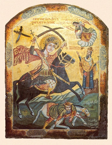 Hij ging naar het heiligdom van Sint Mercurius, wiens zwaard eerst ontbrak en vervolgens onder het bloed terugkeerde.