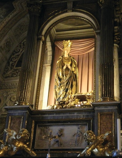 The Virgin's statue was part of a silver-clad grouping executed by woodcarver G. Angelo Mayno around 1520. Napoleonic raiders stripped off the precious metal and destroyed the other statues. In 1946 Pope Pius Xll proclaimed the Blessed Virgin of Tirano “special heavenly patron of all Europe.”