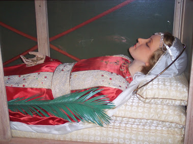 “In 304 A.D., a native of Belgrade, widow and mother, was martyred for her magnificent defense of the Catholic Faith at Mitrovica, Yugoslavia. This was near the end of one of the fiercest Roman persecutions. She was beheaded and cast into the Sava River. Devoted Christians retrieved and buried her in the Roman catacomb of St. Priscilla, until she was given to the Sinibaldi family chapel. In 1927 her relics were given to the Poor Clares in Rome, who later moved them to the Poor Clares in Chicago. The remarkably preserved bones of the Saint were partly encased in wax and a be-jeweled red robe. Cardinal Mundelin of Chicago gave permission to celebrate her feast day on May 4th. After 40 years, St. Adrian’s Church in Chicago received her relics for veneration and she became known as the “Miraculous Saint of Great Faith,” and the saint of many miracles. With the coming of the Vatican II spirit, controversy arose and the Chicago cardinal made sounds like he wished to be rid of her and to bury her bones in the local cemetery. However, devoted clients of St. Maximina transported her remains to the Byzantine nuns of St. Clare in North Royalton, Ohio, where they remain to this day the object of many devoted visits and prayers. Many miracles are still being reported as the result of prayers made to this marvelous Martyr of the holy Catholic Church. If you need a miracle in your life, my advice is for you to go to St. Maximina.” – from The Angelus