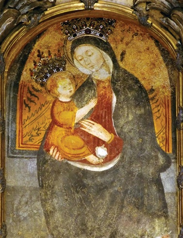 In 1592 Giulio Sargiano went hunting for game and accidentally shot a small roadside shrine containing a fresco of the Madonna and Child. Legend has it that upon seeing the damage he caused, Sargiano was filled with grief and saw blood flowing from the wounded fresco. The remorseful hunter surrendered his firearm and began to collect money to make repairs.