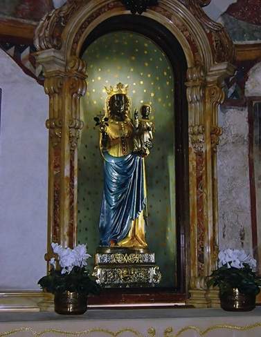 And within the complex is the ancient image of the Black Madonna of Oropa. Her veneration was introduced by San Eusebio, who in the third century brought from the Holy Land a sculpture of the Virgin that is believed sculpted by the community of St. Luke the Evangelist.